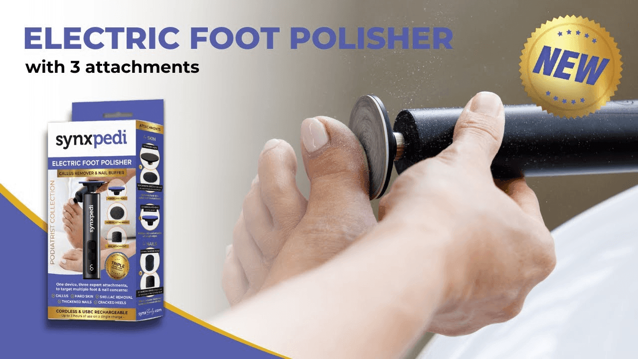 The Synxpedi Foot Polisher is a podiatrist-approved device designed for effortless, salon-quality results in the comfort of home. Its nano glass technology and dual-use design combine gentle exfoliation with powerful results.